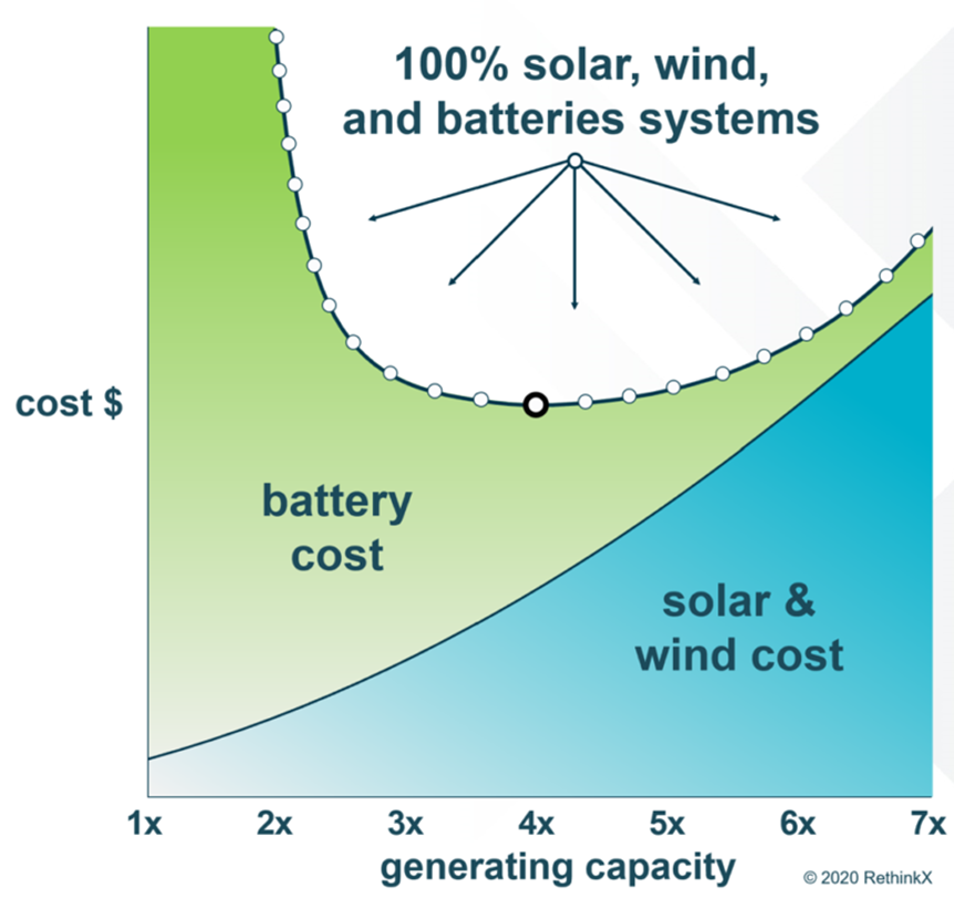 In 2020, a landmark report by RethinkX, Rethinking Energy 2020-2030: 100% Solar, Wind, and Batteries is Just the Beginning, took these conclusions further. The report found that the most optimal and least cost designs of renewable energy systems would involve building out solar and wind generation capacity by three to five times demand, which would permit a huge reduction in battery storage requirements.