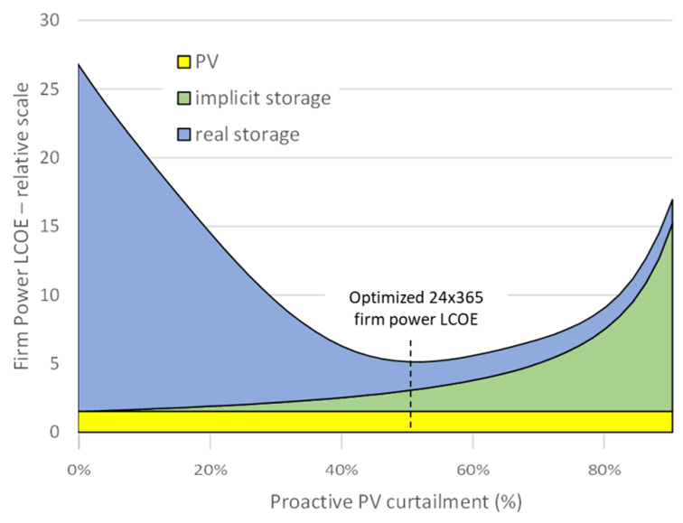 Most importantly – and counter-intuitively – the variable-to-firm transformation entails overbuilding and proactively curtailing the VRE [variable renewable energy] resources, a strategy also known as applying implicit storage… Overbuilding is defined as building more VRE resources than would be needed to meet load requirements on an energy basis. This overbuilt resource is then dynamically curtailed when there is excess VRE production (when production exceeds demand and storage reserve are full).