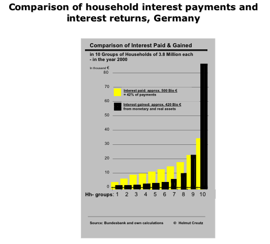 Interest payments are a mechanism for transferring wealth from the poor to the rich, both within nations and internationally. That and how this transfer occurs has been demonstrated in depth by the German researcher Helmut Creutz (2009), as can be seen in the chart showing a comparison of the interest payments and interest returns for German borrowers and lenders depending on their wealth (see below).