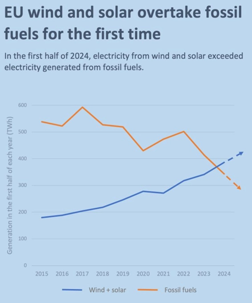 In 2020, for the first time, renewables (wind, solar, hydro, biomass) generated more electricity in the EU than all fossil fuels combined. That trend has continued. By 2024, clean sources (including nuclear) provided 47% of EU electricity, whereas fossil fuels supplied only 29%.