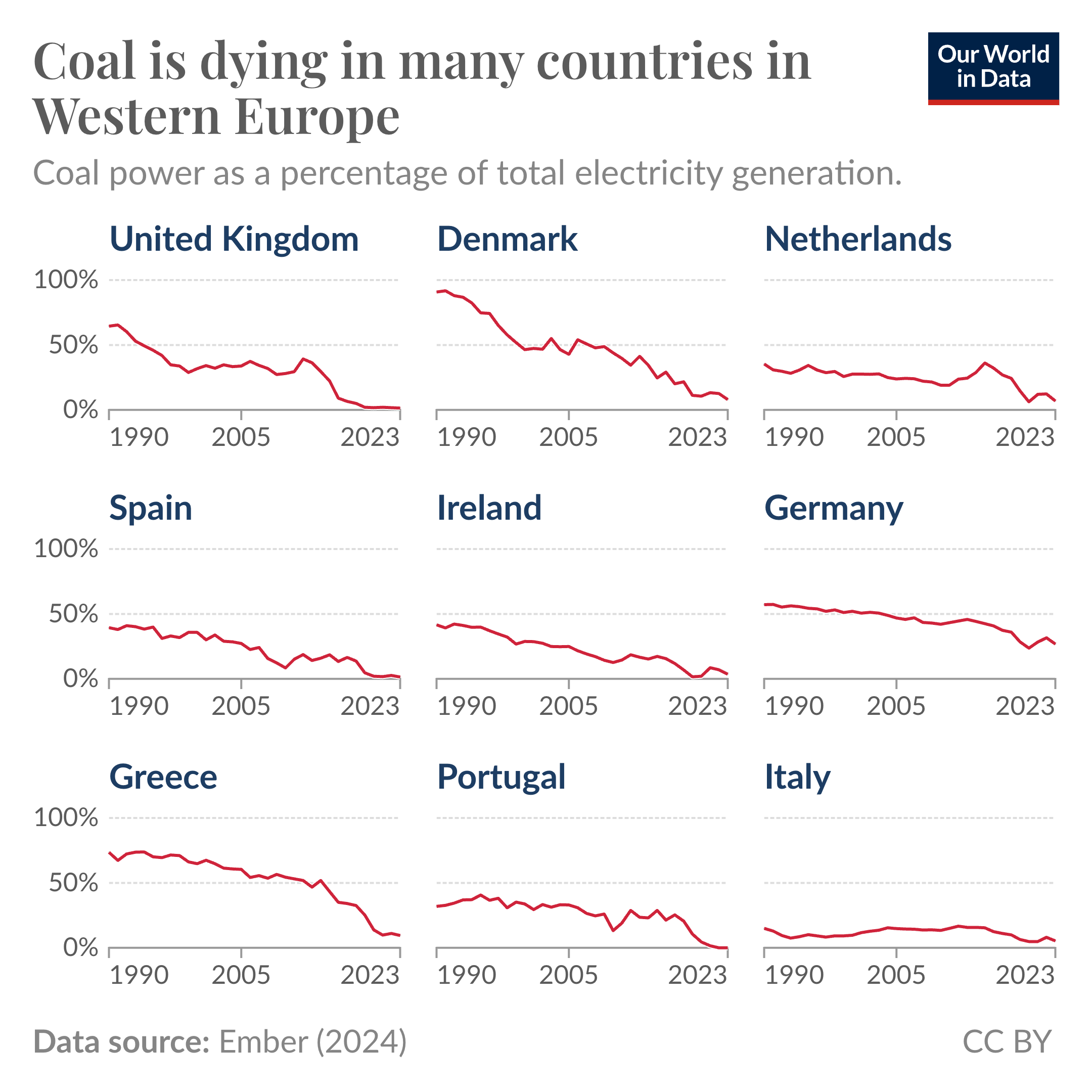 Germany, long Europe’s largest coal consumer, cut coal power by 54% from 2015 to 2023 as wind and solar surged (even as it also phased out nuclear). It plans to fully retire coal by 2030, with renewables filling the gap.