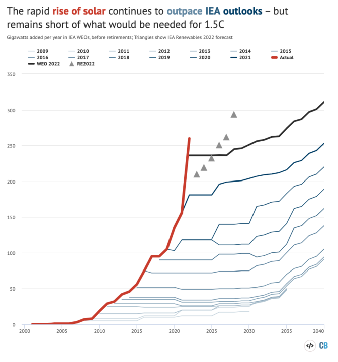 As previously noted at AoT, robust projections show that the competitive force of renewables puts them on track to disrupt and displace fossil fuels in the same way almost entirely by around mid-century. Renewables are already scaling far faster than conventional analysts like the IEA have anticipated.