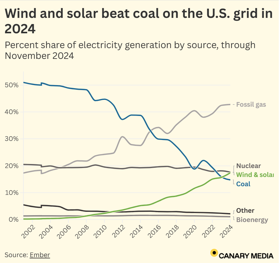 By 2024, wind and solar farms produced 17% of US electricity, edging out coal’s share (which fell to 14%) This milestone confirms a genuine transition: a decade ago, coal delivered around half of US power, and renewables (excluding hydro) were a sliver; now coal is a distant third behind gas and renewables. The outcome is an absolute decline in fossil fuel burning.