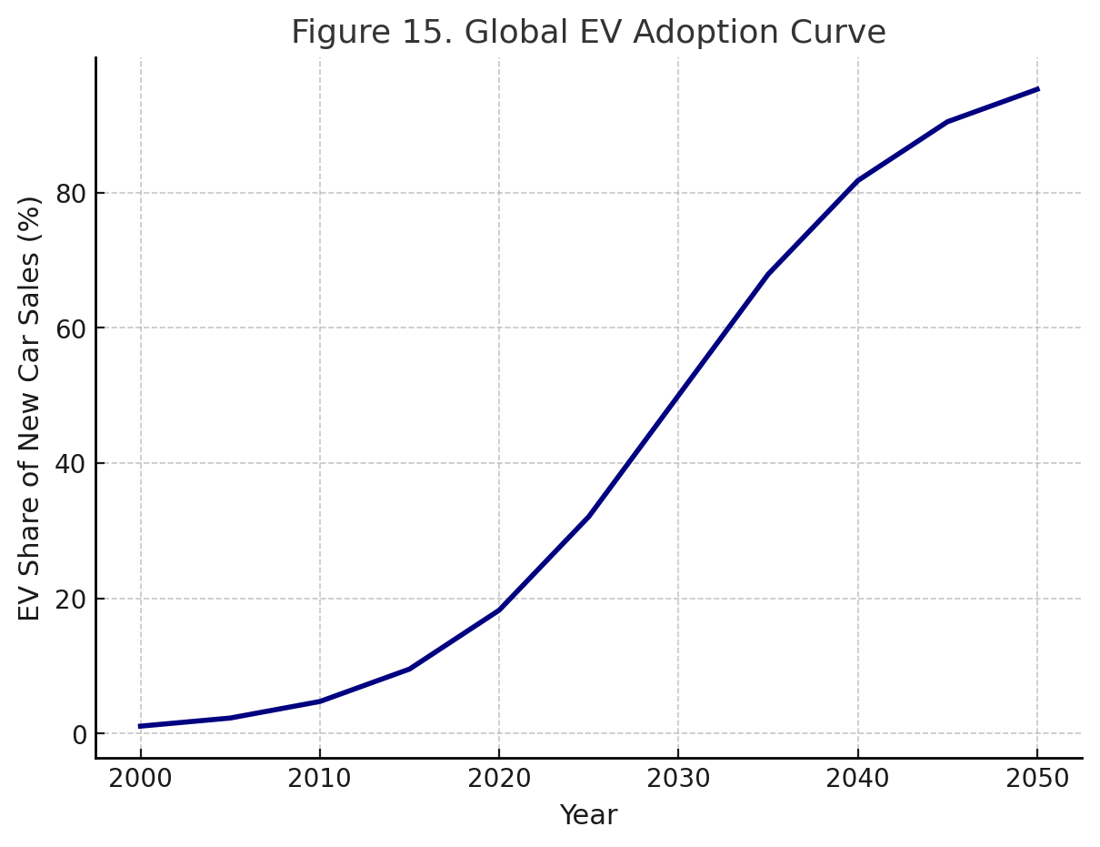 Now turn to transport, a sector that has always been tightly bound to energy. Here, too, the signs of transition are clear. Electric vehicles (EVs) are scaling globally on an unmistakable S-curve (Ahmed 2024, p.17). At the same time, autonomous driving technology is following a learning curve that, if maintained, will reach maturity by the mid-2030s (Ahmed 2024, p.18).