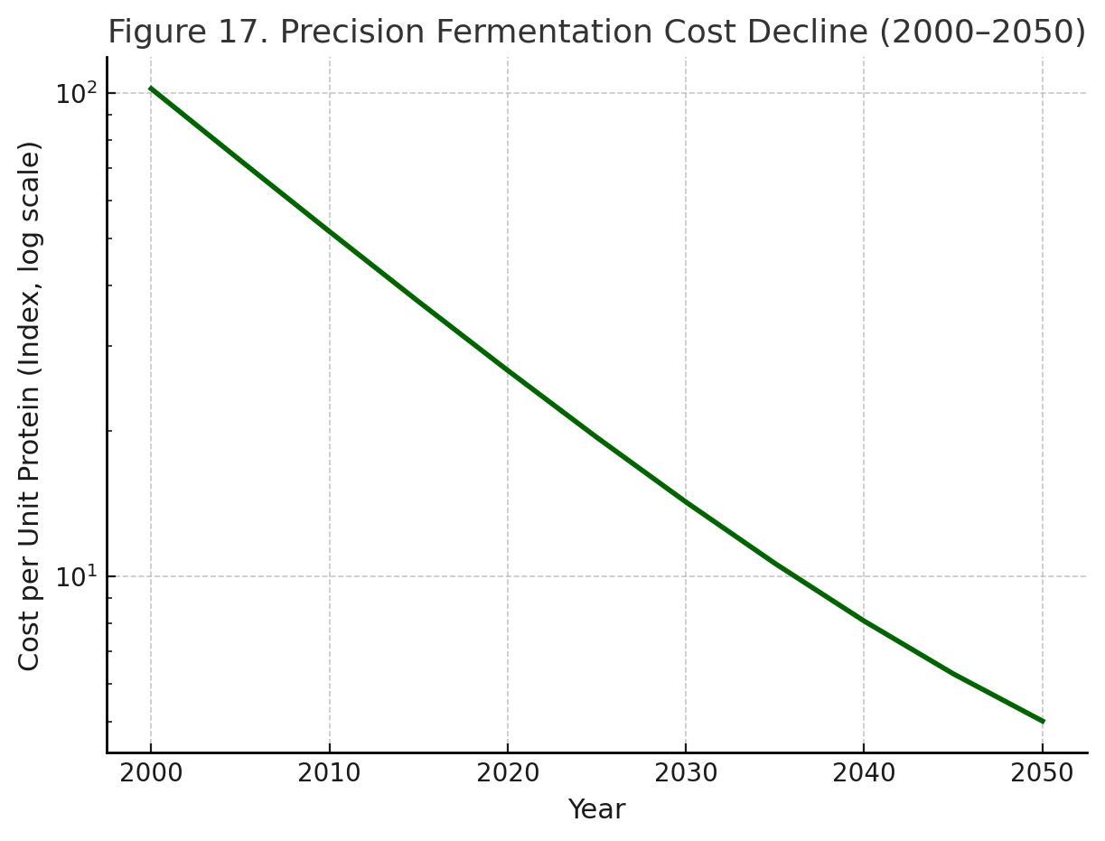 The same dynamic is unfolding in food systems. Industrial livestock farming is one of the largest drivers of land-use change, emissions, and biodiversity collapse. But it is also on the cusp of disruption. Precision fermentation and cellular agriculture — technologies that brew proteins the way we brew beer — have seen costs fall exponentially, with adoption projected to accelerate through the 2030s (Ahmed 2024, p.18–19).