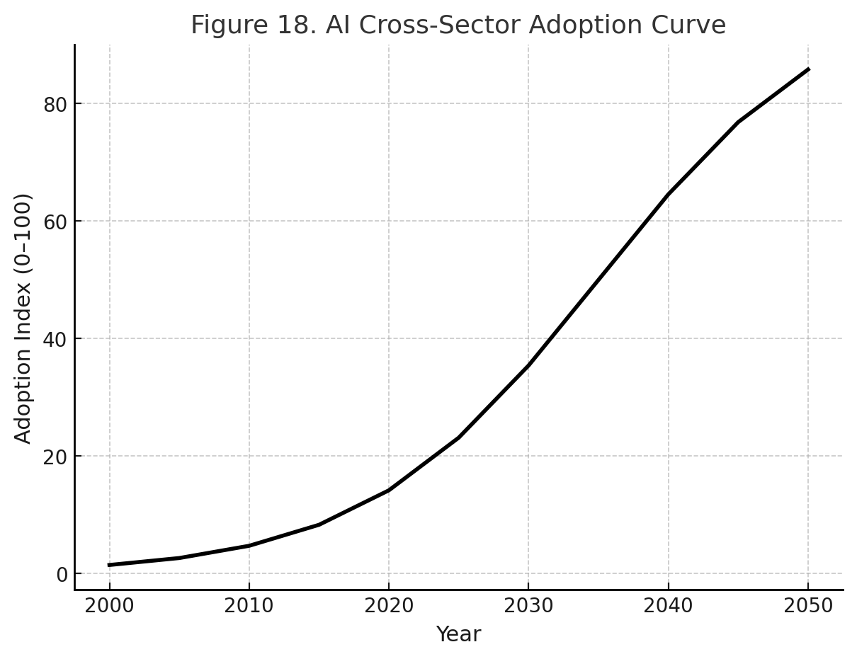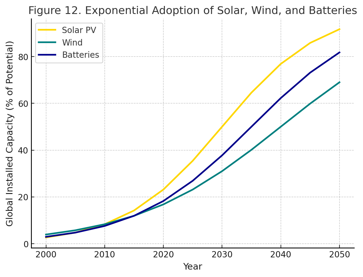 The graphs are unmistakable: steep downward cost curves paired with steep upward adoption curves. Project them forward, and the evidence suggests that by mid-century solar energy will dominate global electricity production on economics alone. This is not speculation. It is the empirical signature of a disruptive phase transition.