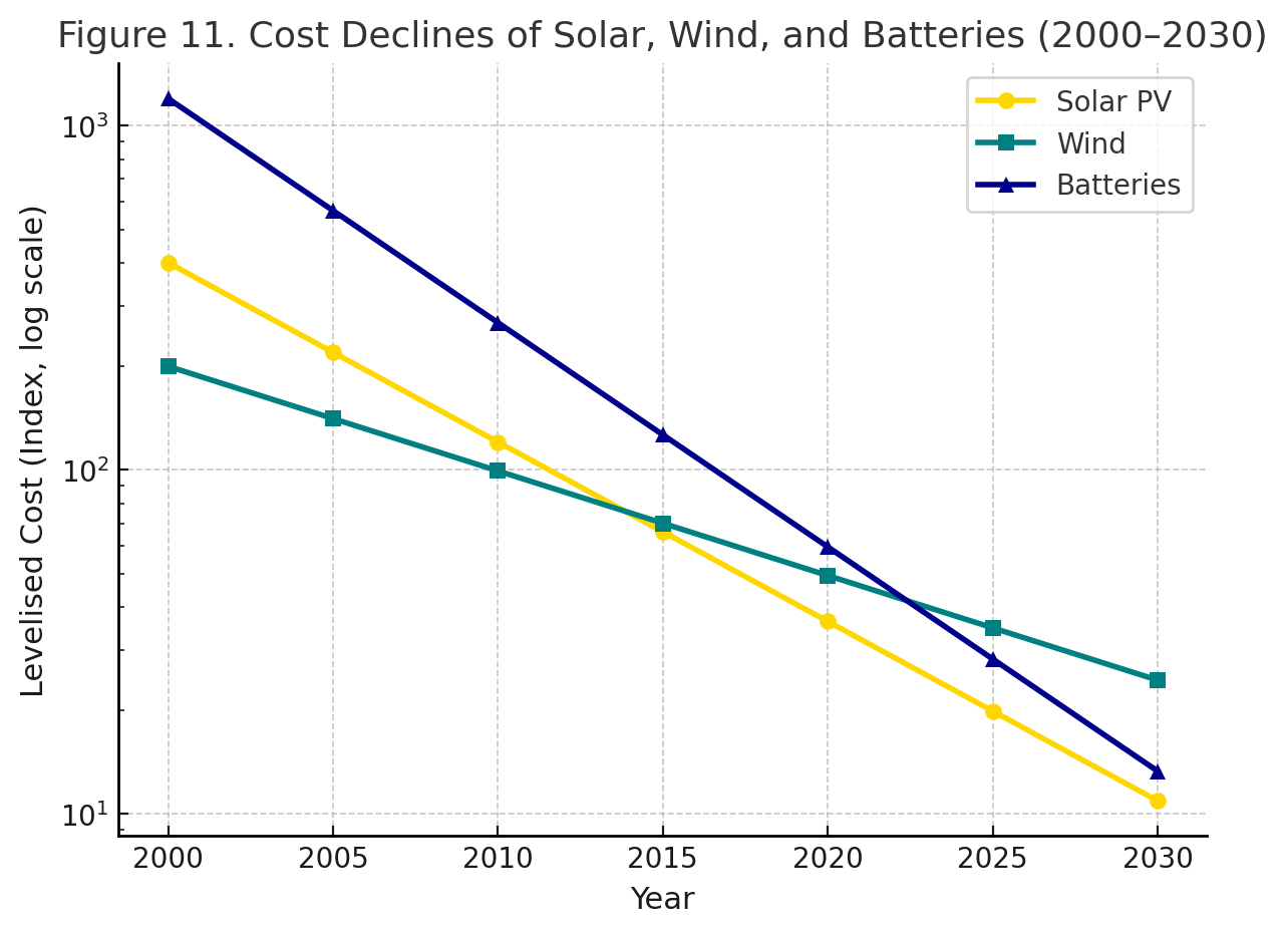 Think first about energy. For two centuries, industrial civilisation was powered by fossil fuels. That era is drawing to a close. On one side, we have the terminal decline of fossil fuel net energy: the falling energy returns of oil, gas, and coal that I described earlier (Ahmed 2024, p.12). But on the other side, a very different pattern is taking shape. Over the last two decades, the costs of solar, wind, and battery technologies have fallen exponentially, while their adoption has accelerated.