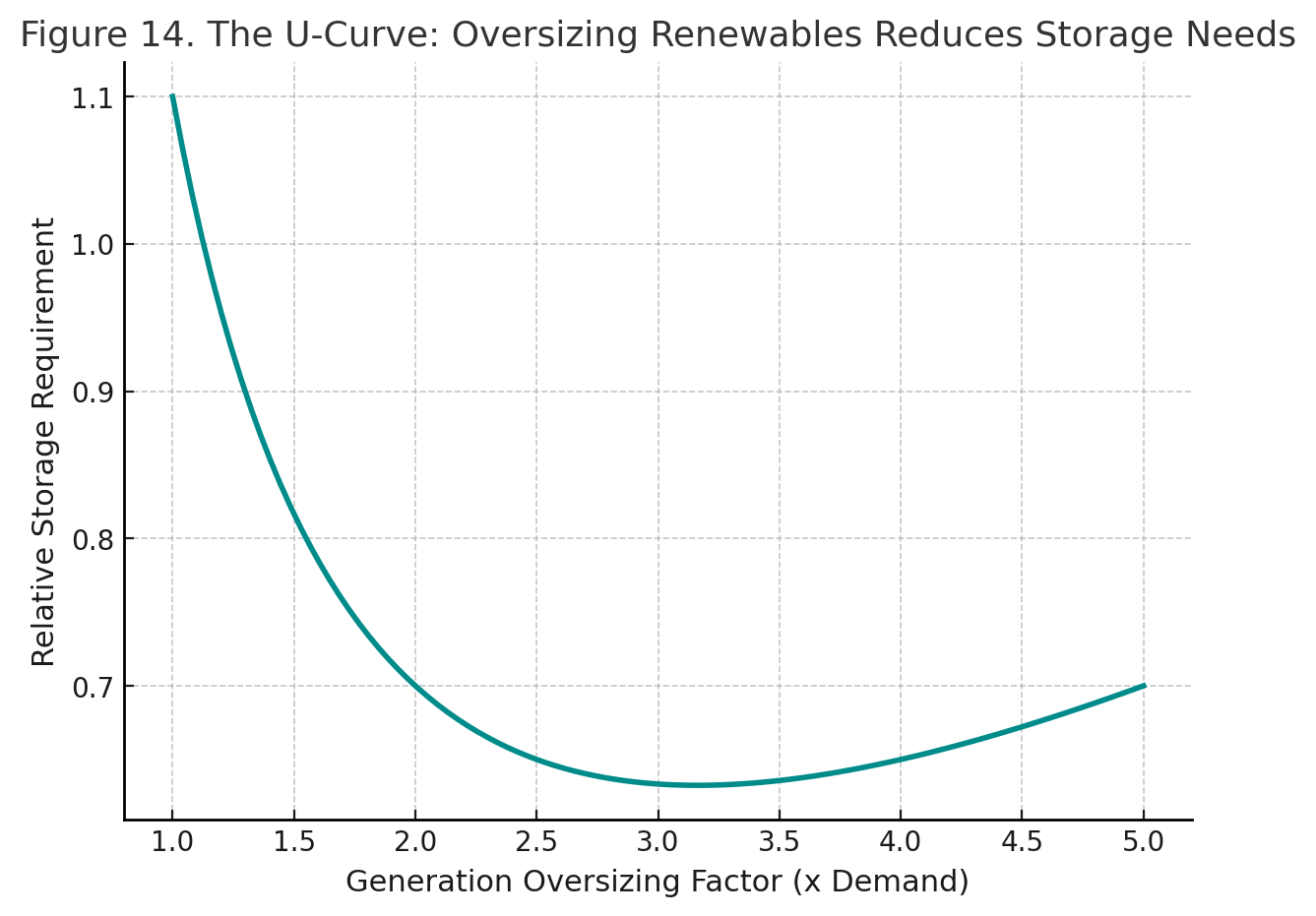 One objection always raised is storage: “the sun doesn’t always shine, the wind doesn’t always blow.” But here the data delivers a surprise. Analysis shows that by supersizing solar and wind capacity relative to demand, you can actually slash the amount of storage required — a counterintuitive “U-curve” relationship (Ahmed 2024, p.16).