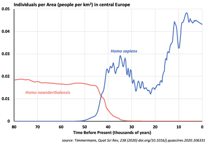 A fascinating study by German climate physicist Alex Timmerman suggests something else. Timmerman created a sophisticated model simulation to compare these factors. He was only able to realistically simulate neanderthal extinction by factoring in homo sapiens’ greater capability to exploit scarce glacial food resources. In other words, humans survived over neanderthals because of greater efficiency in securing and processing energy flows from food resources.