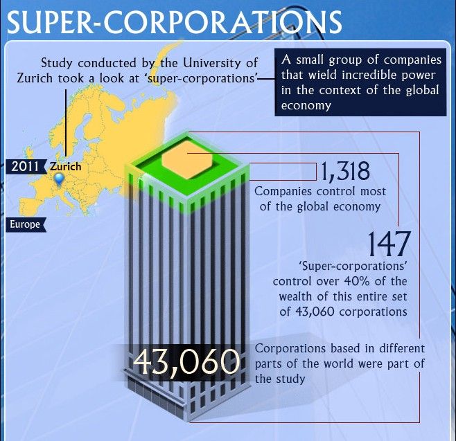 A 2011 study by the Swiss Federal Institute of Technology analysed the network connections between 43,000 trans-national corporations and found that a relatively small number of them (147 corporations) form a highly-connected “super-entity” that controls almost 40% of the total wealth in the network (Coghlan & MacKenzie, 2011).
