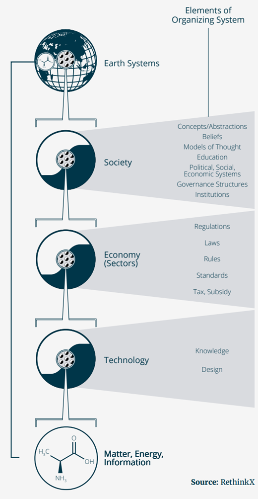 While all this seems like a lot to analyse, one framework which made a significant advance in making sense of how these different systems fit together came in the book Rethinking Humanity by James Arbib and Tony Seba, co-founders of RethinkX, a technology forecasting think-tank.