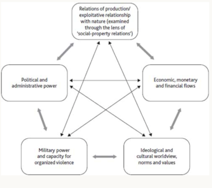 We have systems of production which encompass how we extract from nature to produce the things we need; these are configured by economic relations of social-property or ownership which determine how and who owns, controls, accesses, uses and distributes these resources; we have our economic systems by which we regulate our systems of production and consumption while allocating value to what we’re producing and how it’s consumed; we have our cultural and ideological systems which reflect how we see and understand the world, our place in it, and what things mean to us; we have our legal and political systems which regulate these structures.