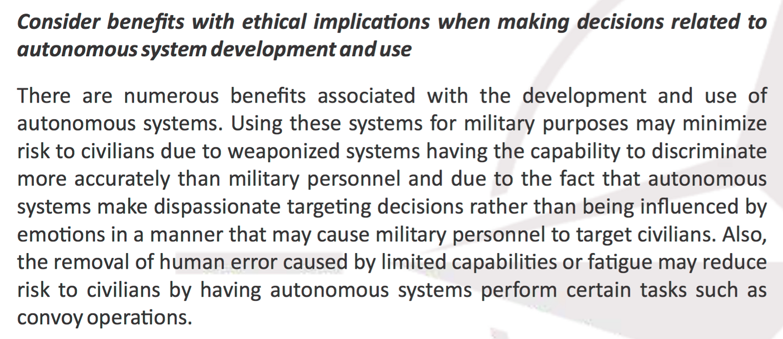Yet the NATO document does not stop there. It even goes so far as to argue that policymakers considering the development of autonomous weapon systems for lethal combat should reflect on the possibility that delegating target and kill decisions to machine agents would minimize civilian casualties.