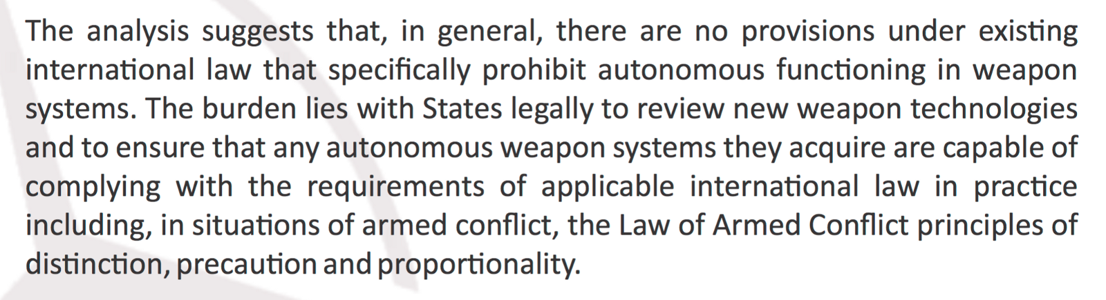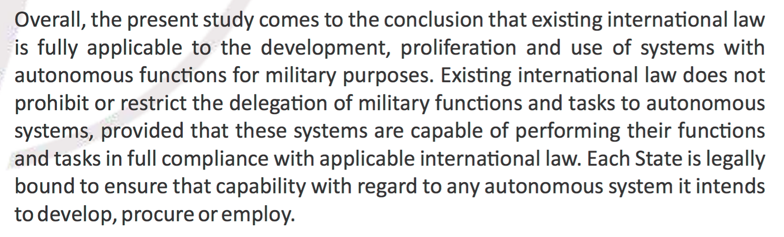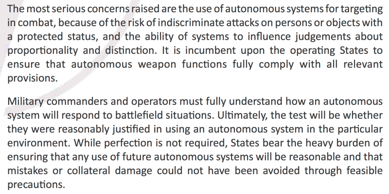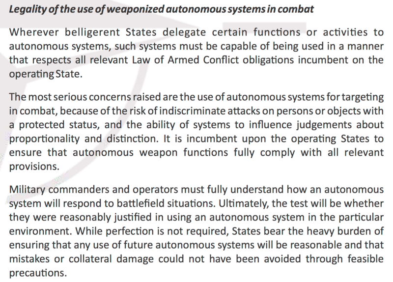 It is the responsibility of specific states, the document concludes, to ensure that autonomous systems operate in compliance with international law in practice — a caveat that also applies for the use of autonomous systems for law-enforcement and self-defence.