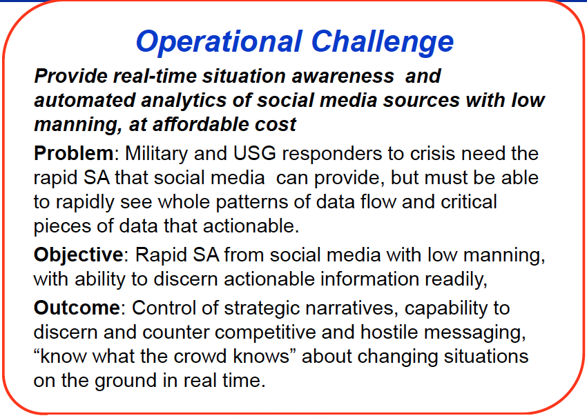 “Develop real-time understanding of uncertain context with low-cost tools that are easy to train, reduce analyst workload, and inform COA [course of action] selection/analysis.”