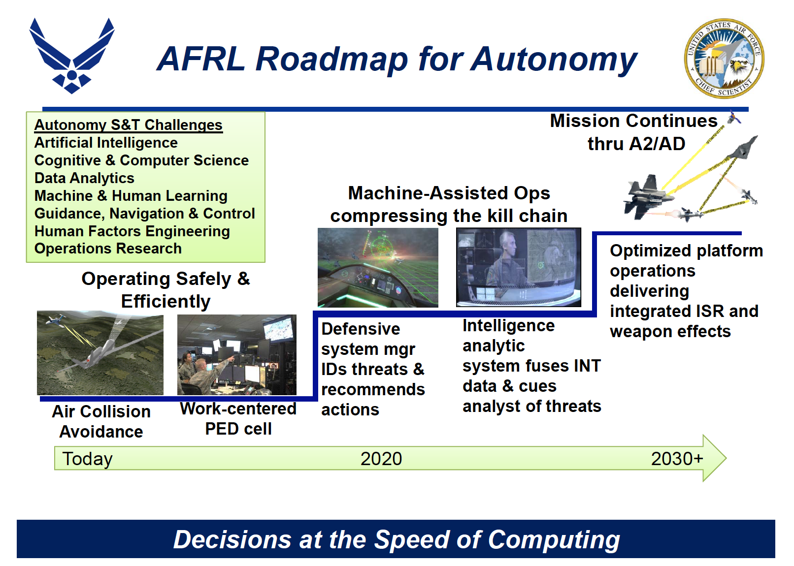 A section titled ‘AFRL [Air Force Research Laboratory] Roadmap for Autonomy’ thus demonstrates how by 2020, the US Air Force envisages “Machine-Assisted Ops compressing the kill chain.” The bottom of the slide reads: