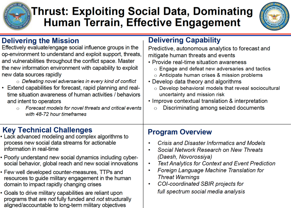 The 2016 human systems roadmap explains that the Pentagon’s “vision” is to use “effective engagement with the dynamic human terrain to make better courses of action and predict human responses to our actions” based on “predictive analytics for multi-source data.”