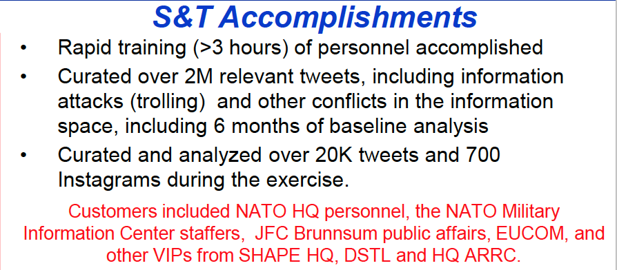 During the exercise, Trident Juncture — NATO’s largest exercise in a decade — US military personnel “curated over 2M [million] relevant tweets, including information attacks (trolling) and other conflicts in the information space, including 6 months of baseline analysis.” They also “curated and analyzed over 20K [i.e. 20,000] tweets and 700 Instagrams during the exercise.”