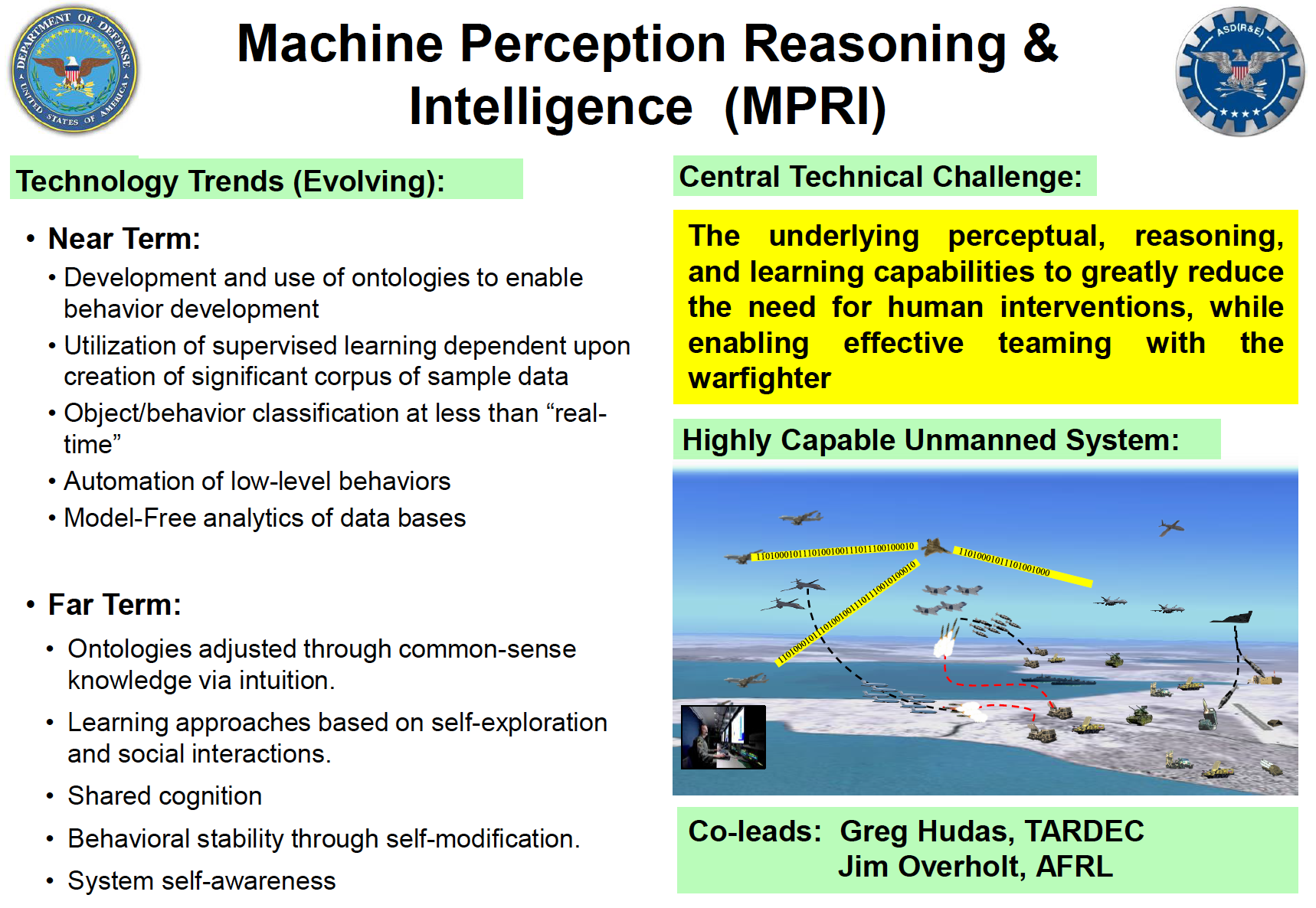 In the near term, machine agents will be able “to evolve behaviors over time based on a complex and ever-changing knowledge base of the battle space… in the context of mission, background knowledge, intent, and sensor information.”