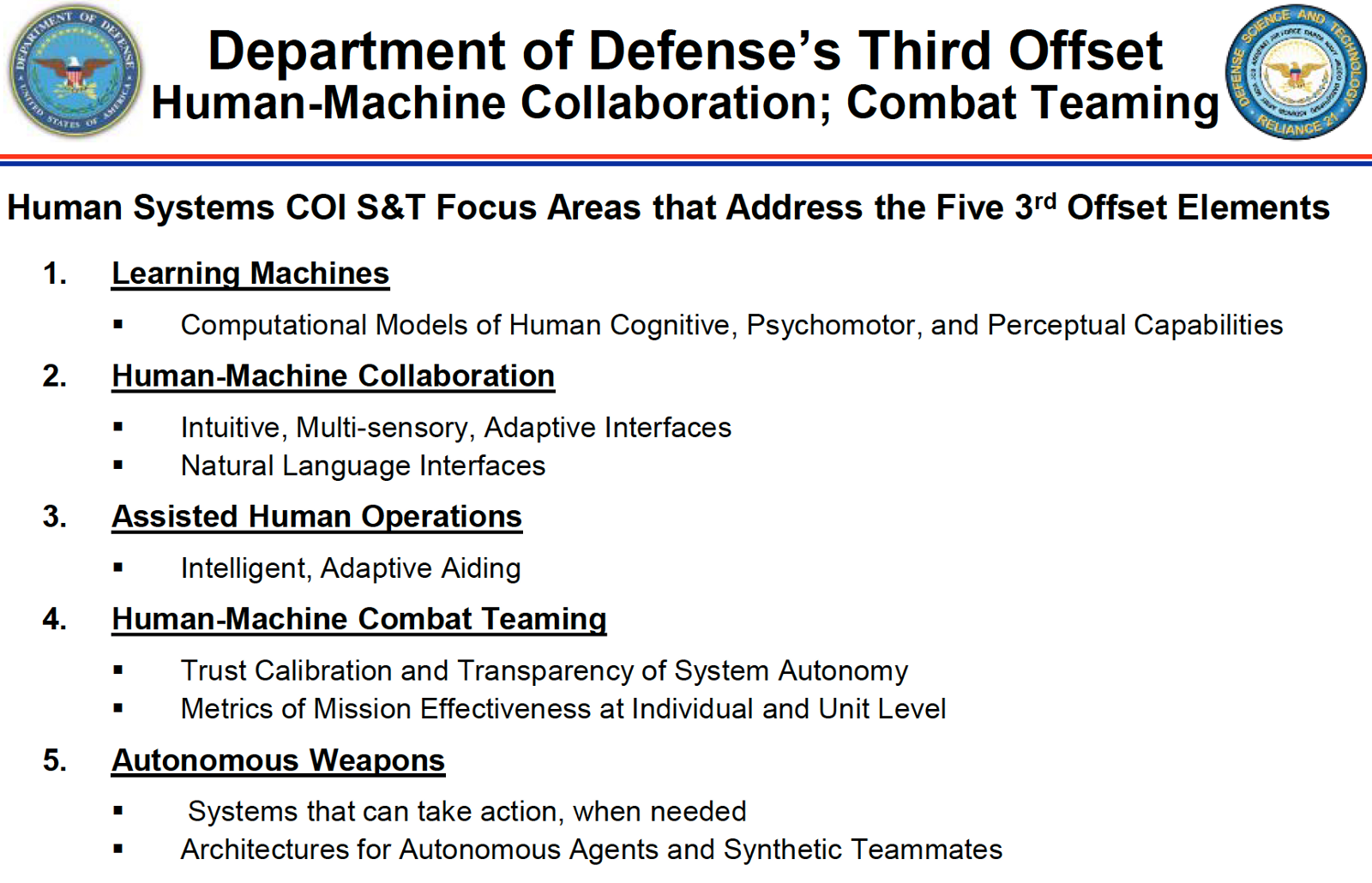 But then the document goes further, identifying a “focus areas” for science and technology development as “Autonomous Weapons: Systems that can take action, when needed”, along with “Architectures for Autonomous Agents and Synthetic Teammates.”