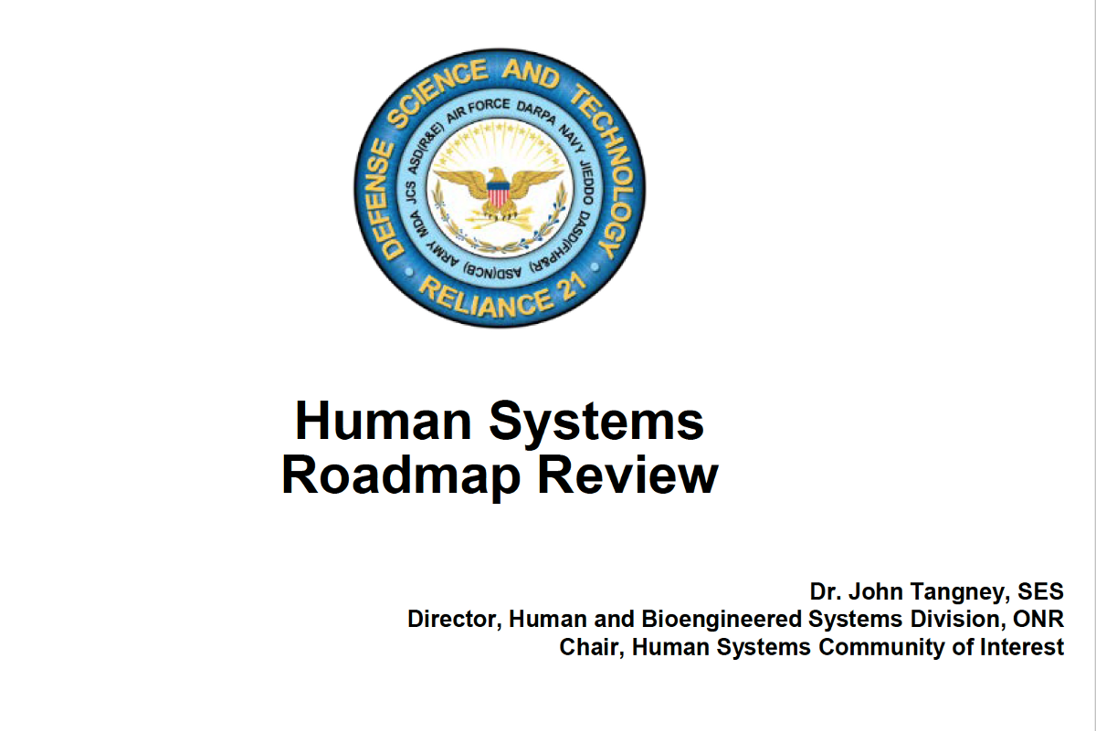 The document is a 53-page presentation prepared by HSCOI chair, Dr. John Tangney, who is Director of the Office of Naval Research’s Human and Bioengineered Systems Division. Titled Human Systems Roadmap Review, the slides were presented at the NDIA’s Human Systems Conference in February.