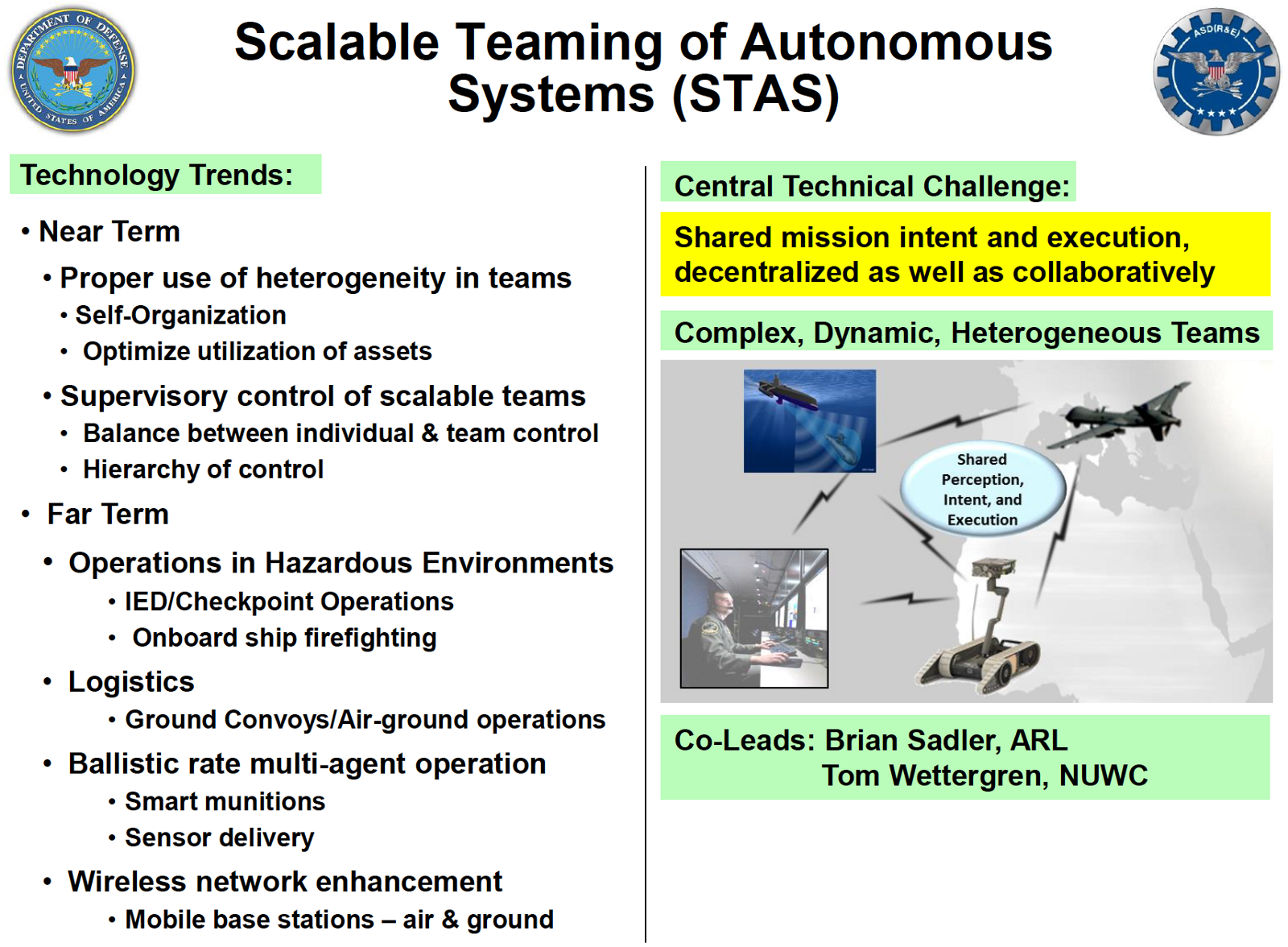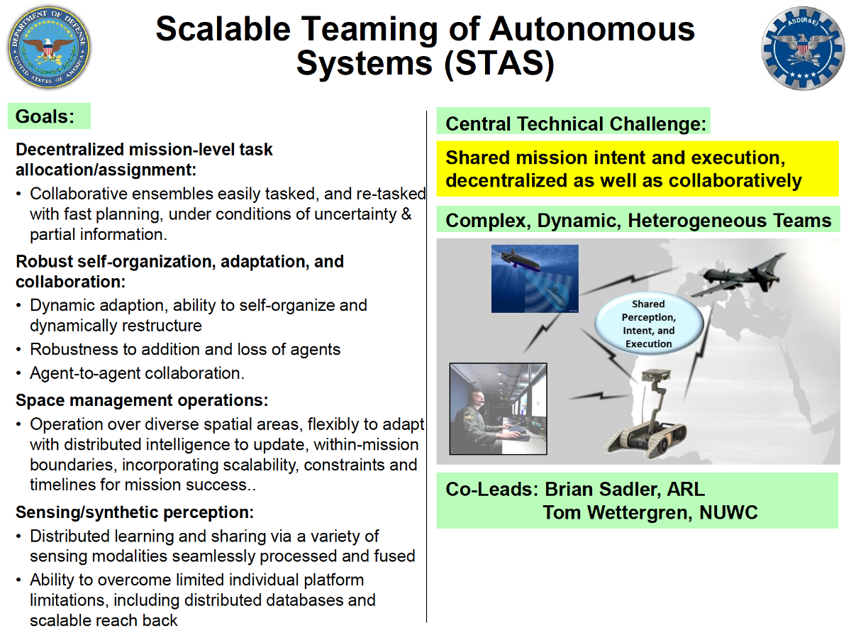 This will finally create the capacity to deploy “Scalable Teaming of Autonomous Systems (STAS)”, free of overt human direction, in which multiple machine agents display “shared perception, intent and execution.”