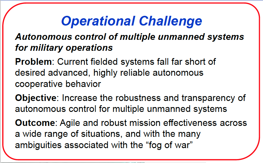 The new systems must display “highly reliable autonomous cooperative behavior” to allow “agile and robust mission effectiveness across a wide range of situations, and with the many ambiguities associated with the ‘fog of war.’”