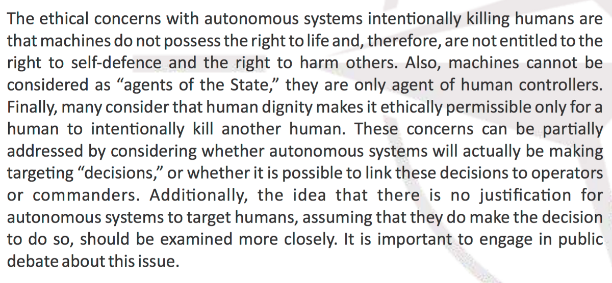 The NATO document, which aims to provide expert legal advice to government policymakers, sets out a position in which the deployment of autonomous weapon systems for lethal combat — in particular the delegation of targeting and kill decisions to machine agents — is viewed as being perfectly legitimate in principle.