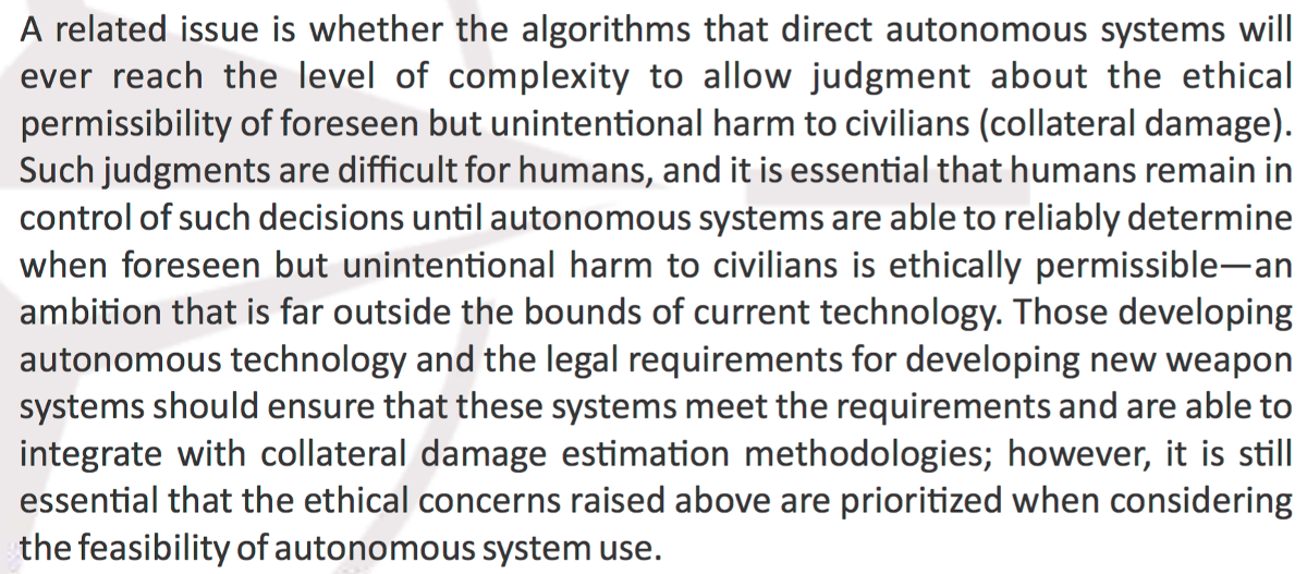 In other words, NATO’s official policy guidance on autonomous weapon systems sanitizes the potential for automated war crimes. The document actually encourages states to eventually develop autonomous weapons capable of inflicting “foreseen but unintentional” harm to civilians in the name of securing a ‘legitimate’ military advantage.