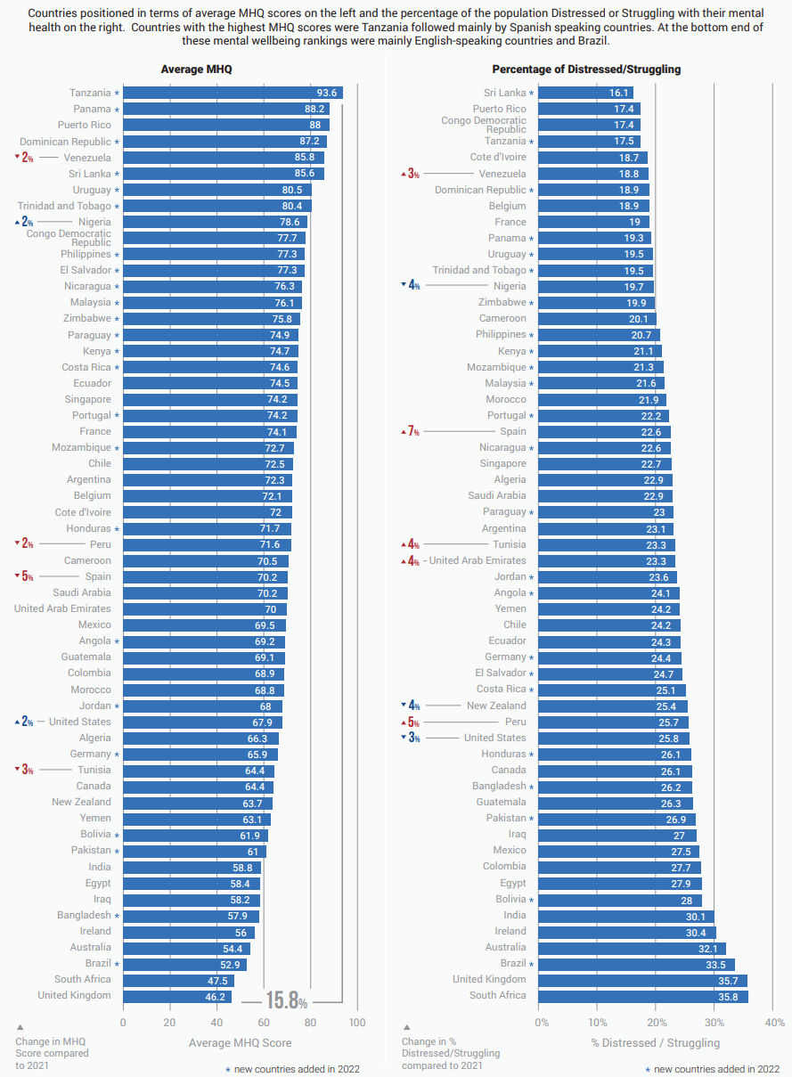 Another major finding is that mental health challenges are increasingly concentrated in some of the wealthiest and most industrialised countries which adopt the more extreme neoliberal economic policies. Although this isn’t a strict rule, it’s notable that countries like Britain, Australia and the United States find themselves at the lower scale of mental health, and the highest percentage of people who report being mentally distressed and struggling.