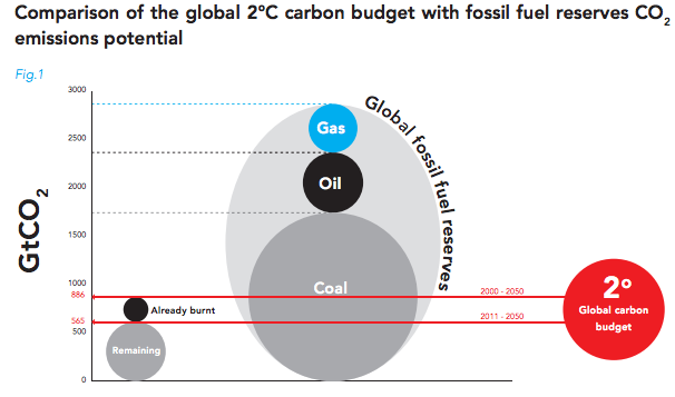 Scientific consensus agrees that we have to keep average global warming well below 2ºC [actually well below 1.5ºC to be safer] if we want to avoid dangerous run-away climate change and the end of civilization as we know it. Therefore most of the remaining reserves have to be considered unburnable carbon. Only a small proportion of the remaining reserves are within the global carbon budget which humanity cannot exceed safely.