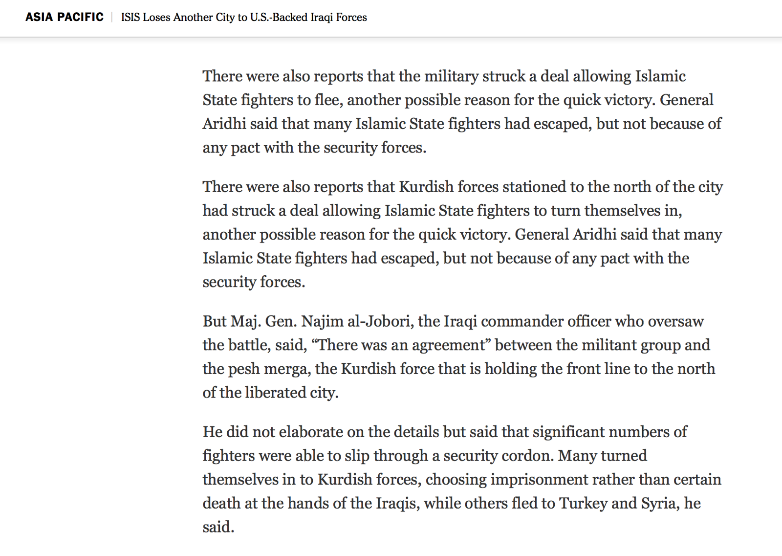 In a direct reference to the ‘open corridor’ policy, the Iraqi commander helming the battle told reporters that “significant numbers of fighters were able to slip through a security cordon” and escape. More worryingly, this was made possible because “There was an agreement” with ISIS, according to Major General Najim al-Jobori, between the militant group and Iraqi Kurdish forces. Some of those retreating turned themselves in, while others “fled to Turkey and Syria.”
