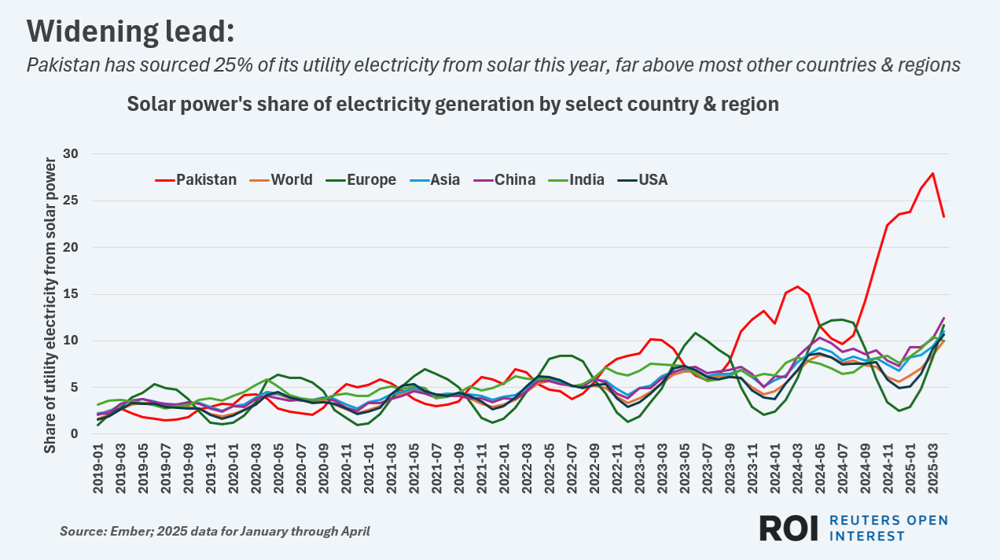 Solar’s Surging Share. Pakistan’s solar boom exemplifies the clean transition: by early 2025, 25% of its utility electricity came from solar – far above most countries (red line). Global (blue) and major regions lag behind but trend upward. This widening lead shows what’s possible with rapid capacity growth. Source: Ember data (Jan–Apr 2025) via Reuters Open Insight.