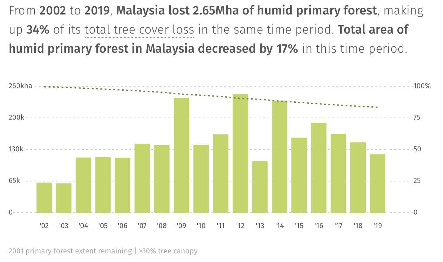 According to Global Forest Watch, the most likely drivers of this welcome decline include local forest conservation policies such as “increased law enforcement to prevent forest fires and land clearing, and the now-permanent forest moratorium on clearing for oil palm plantations and logging.”
