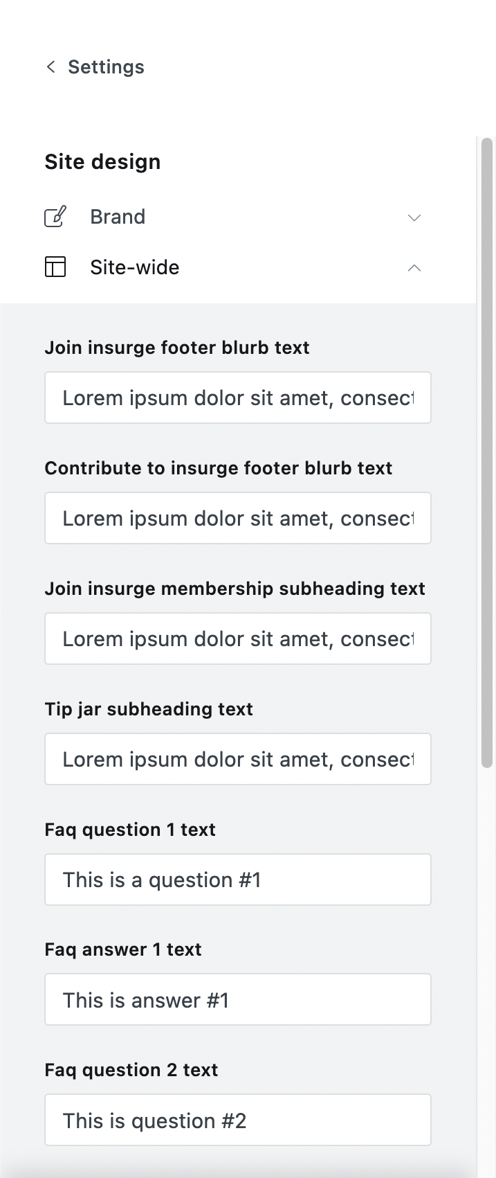 Likewise, in the input boxes under "Join insurge membership subheading text" and "Tip jar subheading text" add in the text you want to appear under the titles on the Join INSURGE page and the Tip Jar page.
