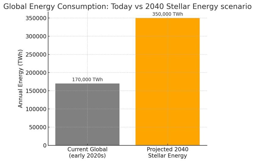In other words, a fully realised Stellar Energy global system by 2040 would not only replace the 170,000 TWh of fossil fuel energy we now consume, but would surpass it by a wide margin. It represents a larger energy foundation for civilisation - one built on clean, perpetual sources.