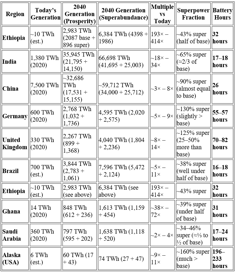 Tropical countries (e.g. Ethiopia, Ghana, Indonesia, Brazil) achieve high output with relatively low storage and surplus fractions, leveraging steady solar (and sometimes wind) to keep batteries under 1 day of capacity. Their multiples of current generation are eye-popping, underscoring how underserved these nations are at present - but by 2040 they can leverage clean energy to surge to prosperity and leapfrog traditional development trajectories.