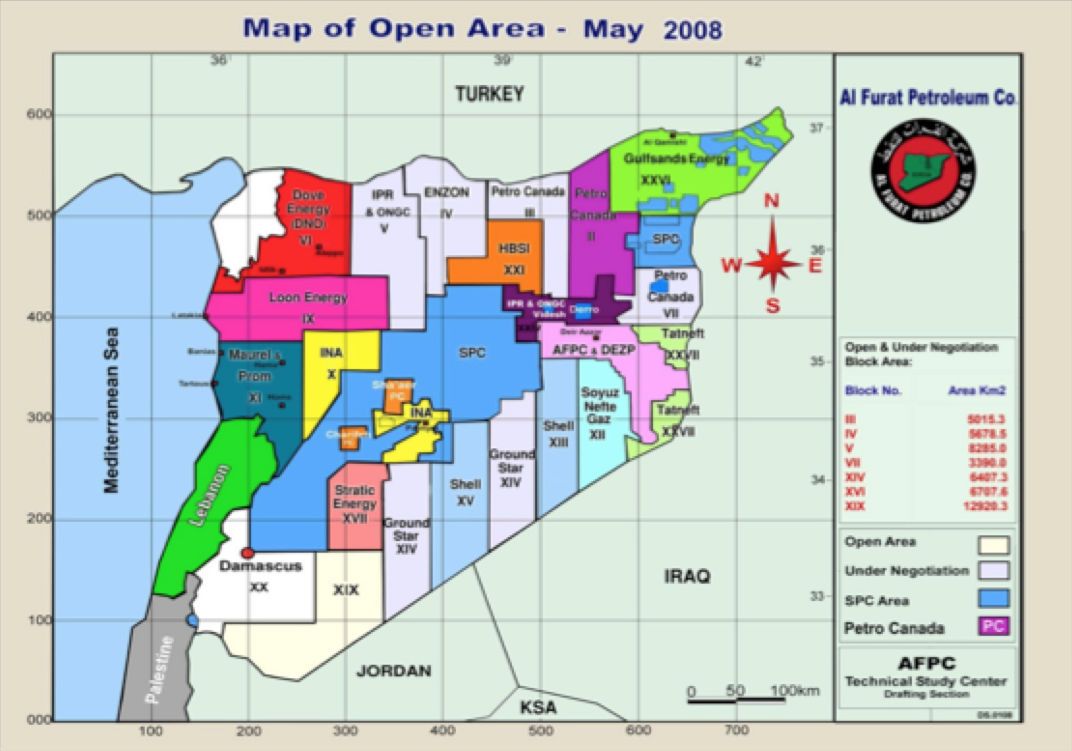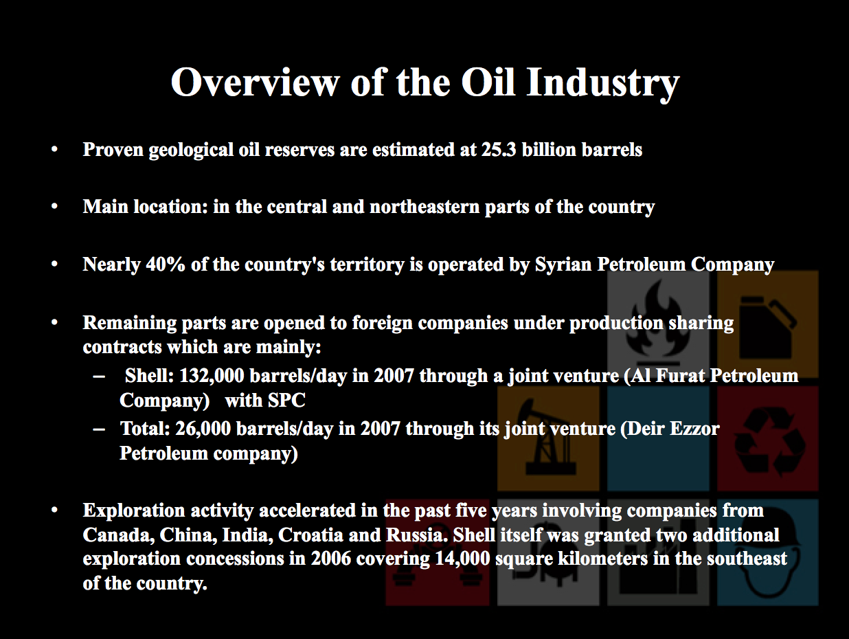 Two years earlier, the Syrian capital, Damascus, was host to the 7th Syrian International Oil & Gas Exhibition, convened by Assad’s Ministry of Petroleum. The exhibition was sponsored by CNPC, Shell, and the French major Total, and was attended by over a hundred representatives of international firms, 40% of whom were based in Europe.