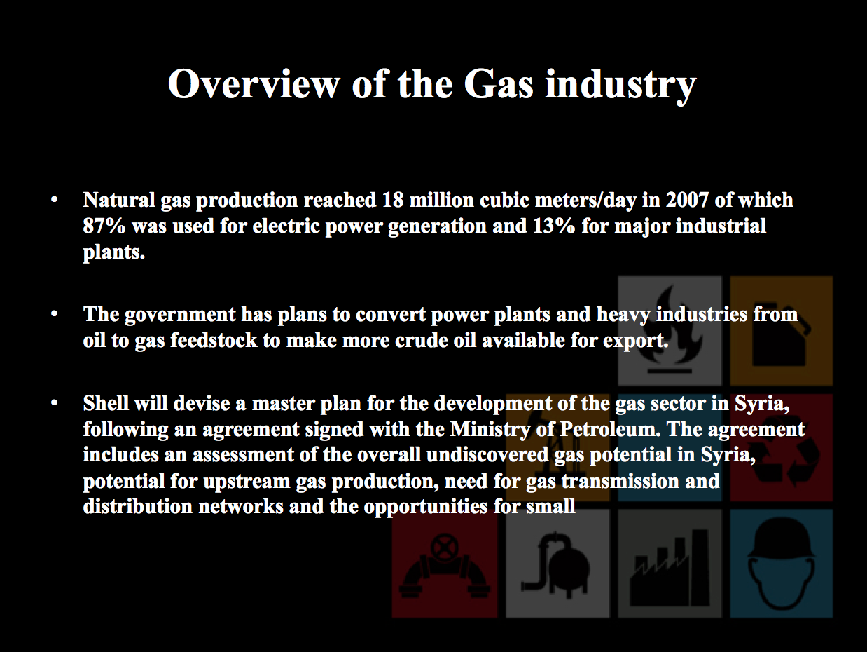 “Shell will devise a master plan for the development of the gas sector in Syria, following an agreement signed with the Ministry of Petroleum,” say the presentation slides, created in October 2010 to promote plans for a new oil and gas exhibition in 2012. “The agreement includes an assessment of the overall undiscovered gas potential in Syria, potential for upstream gas production, need for gas transmission and distribution networks…”