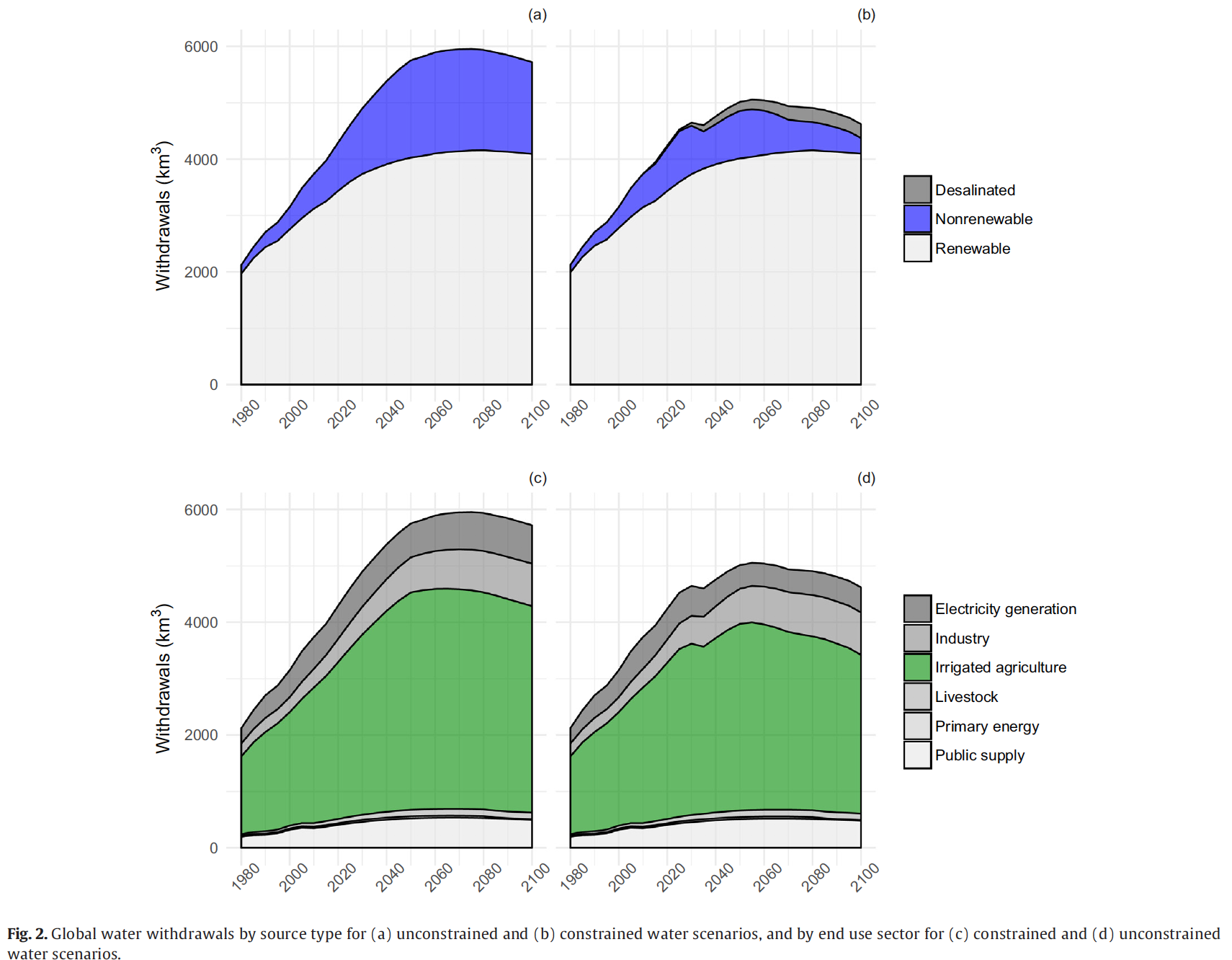 “When we realistically constrain groundwater we do, however, start to observe the effects of scarcity. Some regions do run out of resource, and in other regions withdrawals cease because over-extraction renders the resource uneconomical. This is what causes the peak to occur earlier in the constrained scenario.”