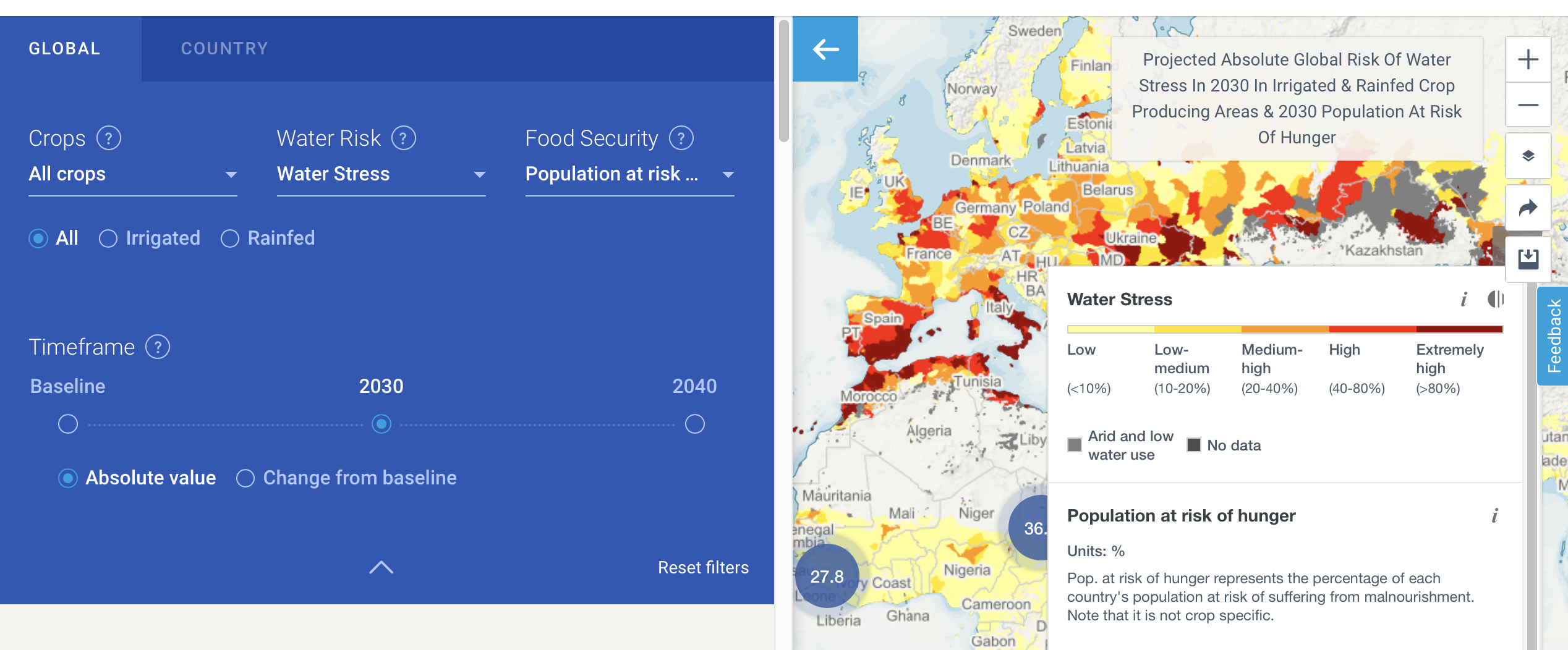 The Four Twenty Seven report bases some of its analysis of water stress on data from a new tool released in November, Aqueduct Food, created by the World Resources Institute. Data from the new tool — which was funded by Cargill, the world’s largest food producer by revenues — reveals that by 2040 as much as 40 percent of all irrigated crops will face acute water stress.