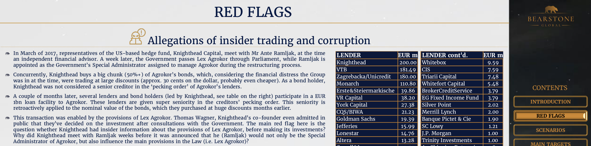 According to an intelligence memorandum for investors prepared in June 2018 by Bearstone Global, a corporate advisory firm in London’s financial district, the sequence of events raised a legitimate suspicion: “The main red flag here is the question whether Knighthead had insider information about the provisions of Lex Agrokor, before making its investments?”