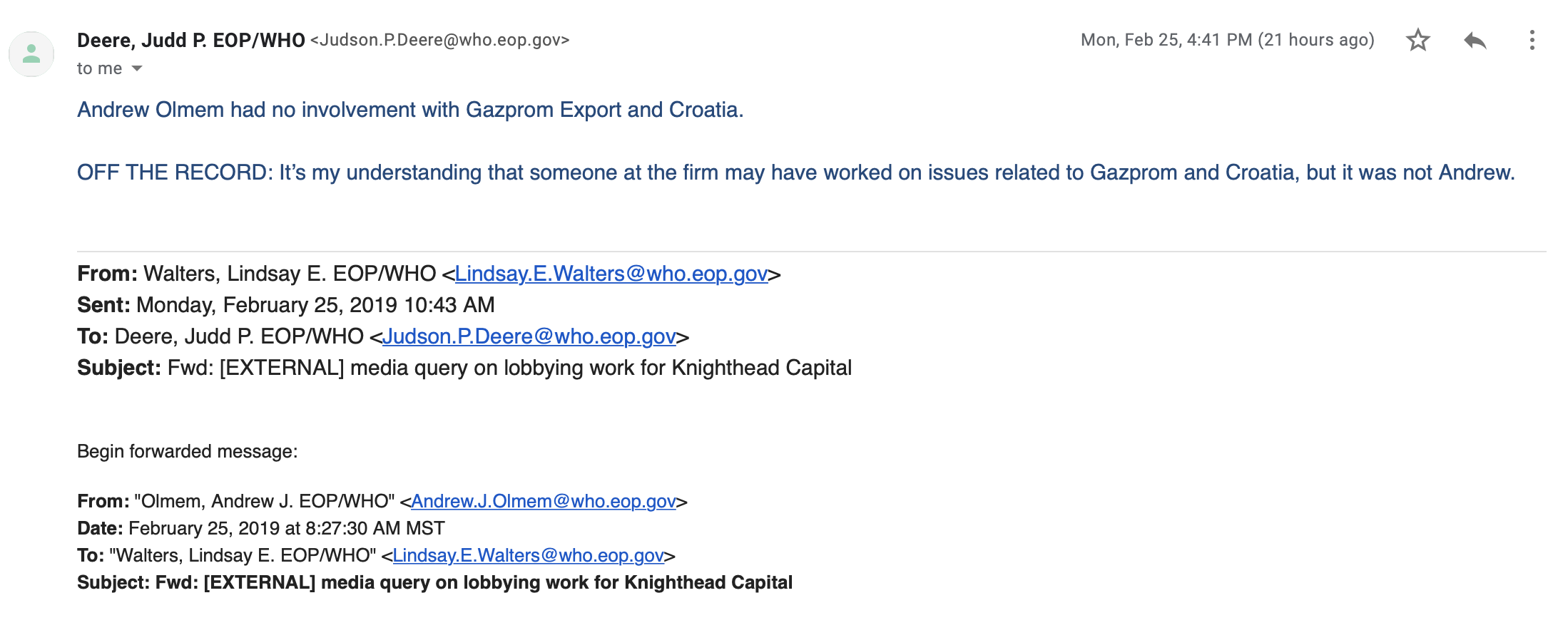 Deere’s astonishing ‘off the record’ statement proves that the Trump White House knew that a Knighthead lobbyist “may have worked on issues related to Gazprom and Croatia”, potentially establishing a direct line of complicity between the White House, Venable, and Knighthead’s activities in Croatia. The White House spokesperson could only have had such an “understanding” of work on Gazprom and Croatia from a senior White House official connected to Venable — likely Olmem himself — who knew about it.