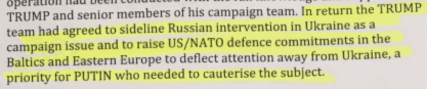 Among the allegations made in the document was that in return for helping Donald Trump win his election campaign, Trump would be expected to make a range of concessions to Russian interests, including an agreement “to raise US/NATO defence commitments in the Baltics and Eastern Europe to deflect attention away from Ukraine, a priority for Putin who needed to cauterise the subject.”